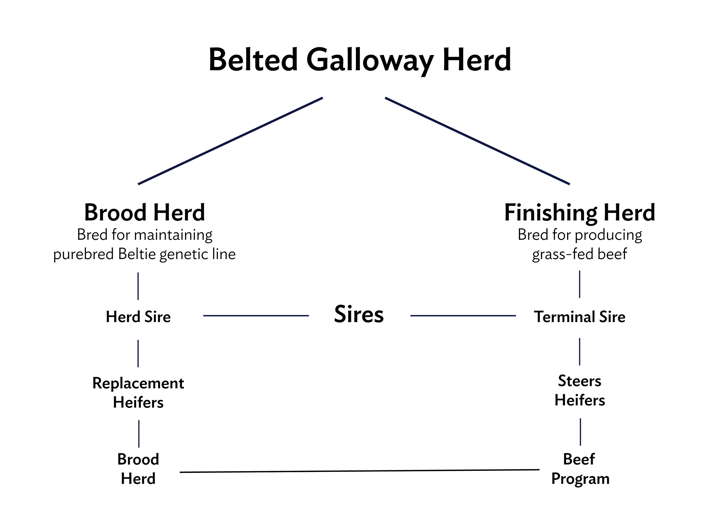 Breeding within the herd is carefully planned and managed seasonally. A sire is a male breeding animal used for reproduction within a herd. With cattle, the sire is the bull that mates with cows and contributes half of the genetic makeup to each calf. Depending on our goals in a given year, we may use more than one sire. One of our bulls, Jelly Beans, is a purebred Belted Galloway and is considered our herd sire. We’ve also added a new herd sire, a purebred Belted Galloway named Noble, that will replace Jelly Bean later this year. A herd sire helps us maintain a strong, consistent Belted Galloway genetic line and preserve the core characteristics of our brood herd. A brood herd (sometimes called a breeding herd) refers to the group of female cows on our farm that are retained for reproduction rather than raised for meat. The brood herd consists of purebred Belted Galloway mature cows and selected heifers (female cows that have not yet had a calf) that are bred each season to produce calves.