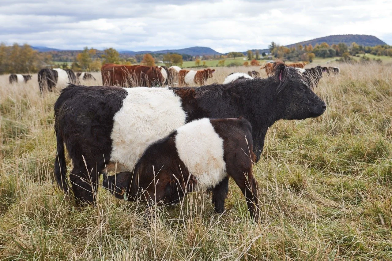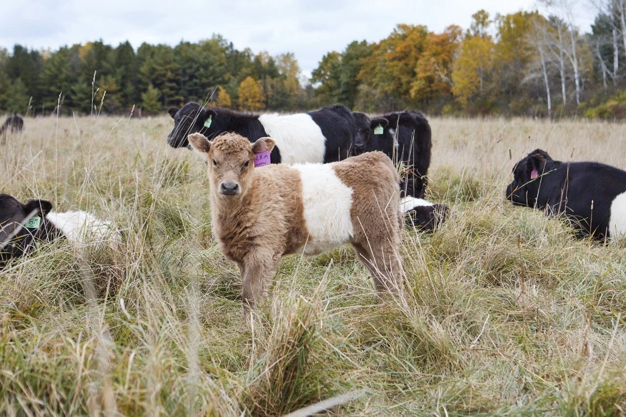 Our cattle program centers on a herd of Belted Galloways, a heritage breed well suited to grass-based farming in northern climates. Known for their hardiness, a moderate frame size, calm temperament, and ability to thrive on forage alone, Belted Galloways align closely with our goals for animal welfare, regenerative land management, and grass-fed beef production.
